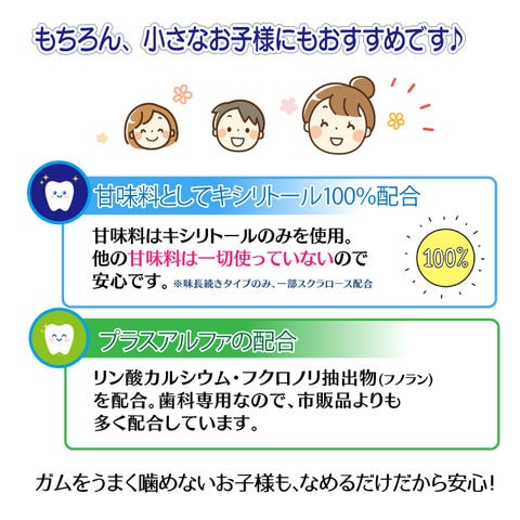 また、歯の再石灰化を増強するキシリトール、フクロノリ抽出物(フノラン)、リン酸-水素カルシウムを配合しているので、歯を丈夫で健康に保ちます。