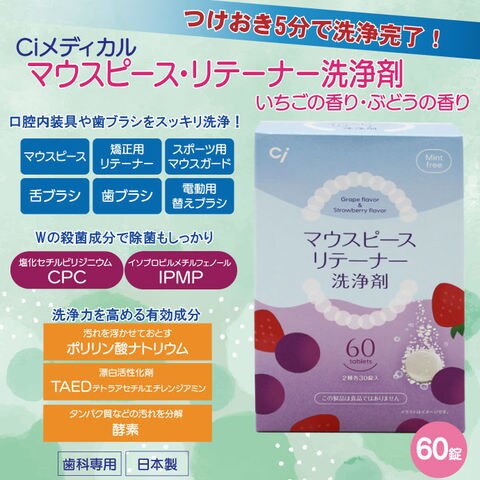マウスピース・リテーナー洗浄剤 60錠入(いちごの香り・ぶどうの香り各30錠)1箱【義歯全錠剤 口腔内装具 歯ブラシ 洗浄 除菌 つけおき CPC IPMP配合】