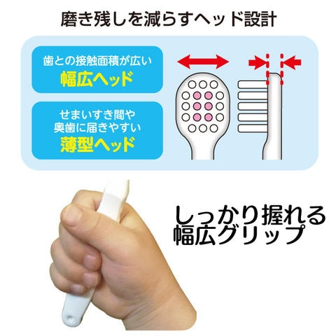 磨き残しを減らす幅広×薄型ヘッド設計。ハブラシが幅広ヘッドなので、ブラッシングが不慣れな子供でも磨き残しが少なくなります。従来品よりも30%厚みをダウンさせた薄型ヘッドで小さな口内でも操作しやすく、せまいすき間や奥歯にも届く。外側やわらかめ植毛で、歯ぐきをいたわりながら歯と歯ぐきの間をしっかり磨ける。