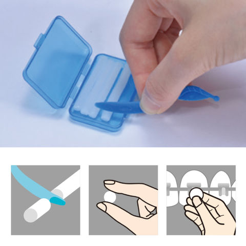 カバーしたいブラケット(またはワイヤー)に、ワックスを軽く押し付けます。ブラケットの凹凸にワックスが入り込むようにゆっくり押して、そっと指から離します。
