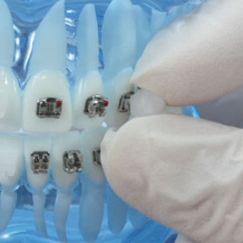 カバーしたいブラケット(またはワイヤー)に、ワックスを軽く押し付けます。ブラケットの凹凸にワックスが入り込むようにゆっくり押して、そっと指から離します。