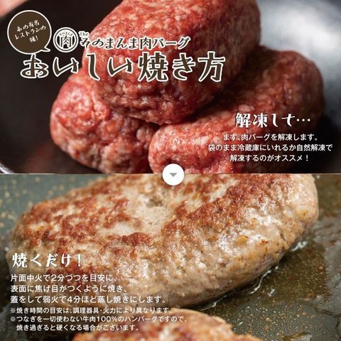 ・旨い牛肉をそのまんま噛みしめる、そんな高級ハンバーグ。 牛100%、つなぎ一切不使用。噛みしめるほど旨味があふれ出す上質な牛肉に、試行錯誤を繰り返し完成した独自のスパイスのみを練り込んだハンバーグ、【肉】そのまんま肉バーグ。まさに大人気の一流レストランの味!