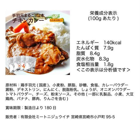 原材料:鶏手羽元(国産)、小麦粉、豚脂、砂糖、食塩、カレーパウダー、澱粉、デキストリン、にんにく、脱脂粉乳、しょうが、オニオンパウダー、トマトパウダー、チーズ、粉末ソース、その他(一部に乳製品、小麦、大豆、鶏肉、バナナ、豚肉、りんごを含む)