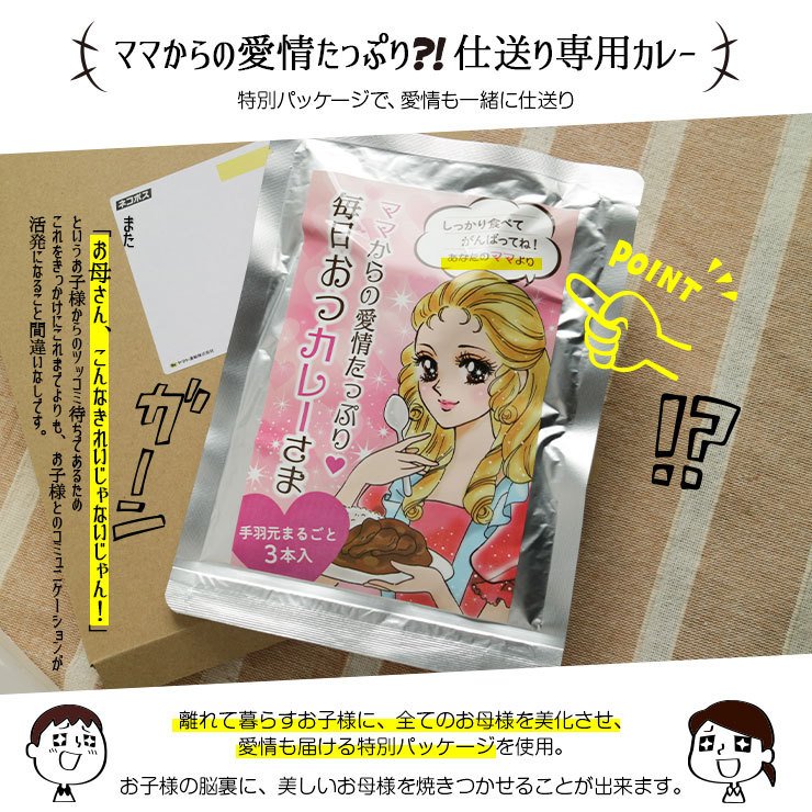 というお子様からのツッコミ待ちであるためこれをきっかけにこれまでよりも、お子様とのコミュニケーションが活発になること間違いなしのネタ、仕送りごはん、しおくり、差し入れ、甘口から中辛の仕送りパックです。 ・食べ盛りのお子様にぴったりの、手羽元3本とルー合わせて350gの栄養たっぷり、メガ盛りボリューム。もりもり食べて、新生活、勉強や仕事に、なお励んでいただきましょう。
