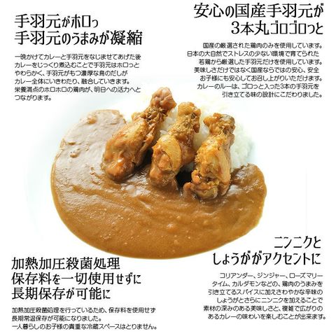 ・メイドインジャパンの厳選された鶏肉のみを手羽元が3本丸ごとごろっと入っている、珍しいレトルトカレーです。