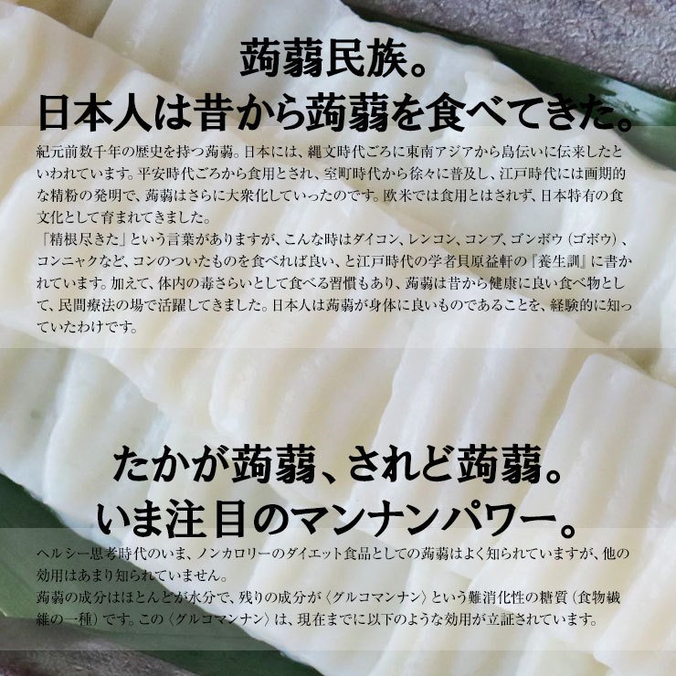 「精根尽きた」という言葉がありますが、こんな時はダイコン、レンコン、コンブ、ゴンボウ(ゴボウ)、コンニャクなど、コンのついたものを食べれば良い、と江戸時代の学者貝原益軒の『養生訓』に書かれています。加えて、体内の毒さらいとして食べる習慣もあり、蒟蒻は昔から健康に良い食べ物として、民間療法の場で活躍してきました。日本人は蒟蒻が身体に良いものであることを、経験的に知っていたわけです。
