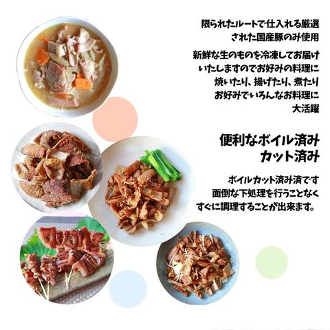 ・限られたルートで仕入れる厳選された国産豚のみ使用。新鮮な生のものを冷凍してお届けいたしますのでお好みの料理に合わせて、ボイル、焼いたり、揚げたりと、お好みによっていろんなお料理を楽しめます。ボイルカット済み済ですので、面倒な下処理を行うことなくすぐに調理いただくことが出来ます。