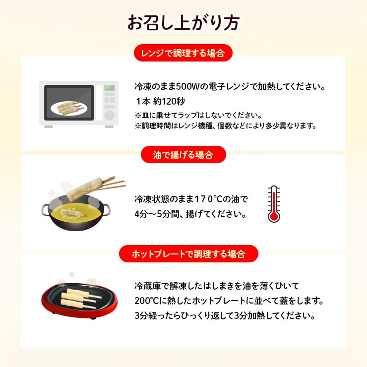 ・冷凍状態のまま170℃の油で2分30秒間揚げて提供できますのでスピードの求められる模擬店などでも迅速に提供することが出来ます。揚げるのがどうしても困難な場合は、解凍してから、フライパンや鉄板にタップリの油を敷き、両面をそれぞれ150秒以上(計5~6分間)程度じっくり焼いて下さい。強火だと表面が焦げますので、焦げないように注意して、やや弱火で焼いて下さい。必ず油は多めに敷いて下さい。