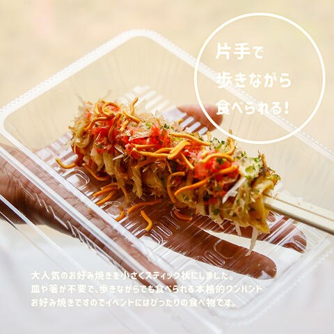 ・大人気のお好み焼きを小さくスティック状にしました。皿や箸が不要で、歩きながらでも食べられる本格的ワンハンドお好み焼きですのでイベントにはぴったりの食べ物です。