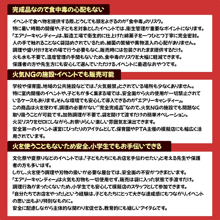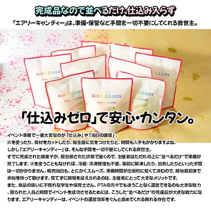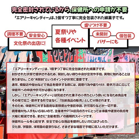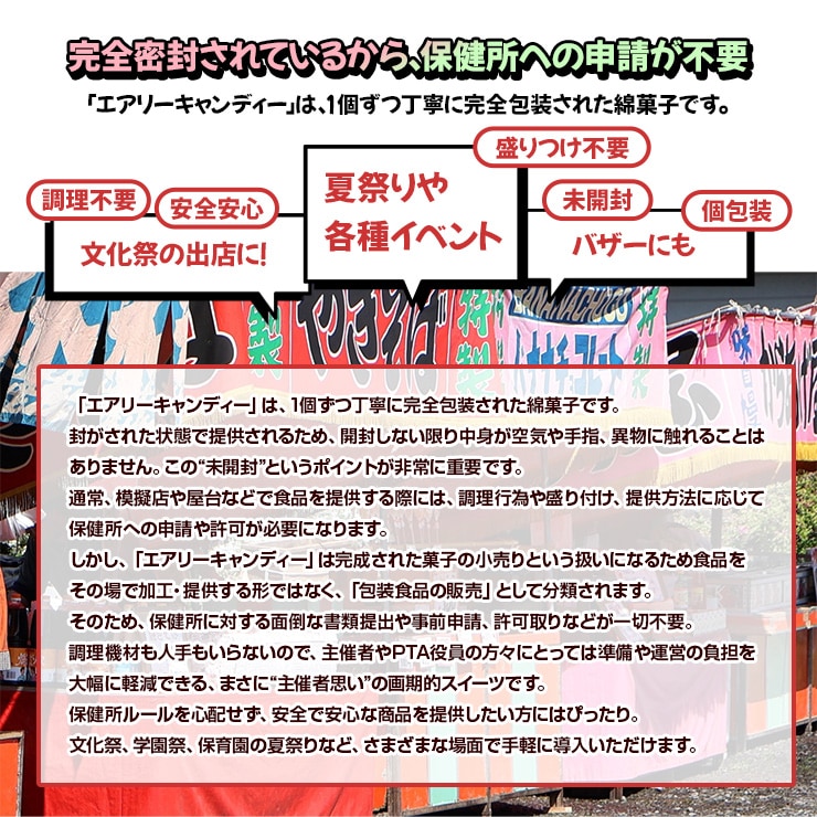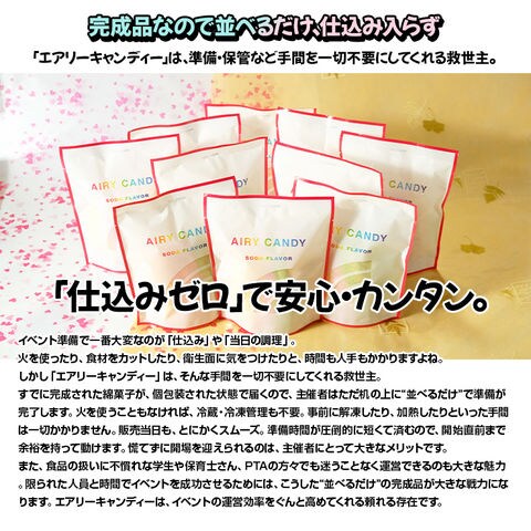 完全密封・調理不要のカラフル綿菓子で、イベント主催者の「面倒くさい」「準備が大変」「火気NG」「保健所の申請が心配」といった不安を一気に解決。
