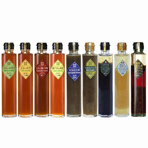 産地直送の素材にこだわったドレッシングの9種セットです。大分県産のかぼすやゆず、大葉、バジルをはじめ、瀬戸内産のレモンやイタリアの熟成バルサミコ酢を使用しました。お料理に合わせて使い分けてお楽しみください。【ノンオイルドレッシング大分のかぼす】大分産のかぼすの爽やかな香りと酸味が特徴です。【ノンオイルドレッシング大分のゆず】やさしい風味の中に、ゆずが豊かに香ります。【ノンオイルドレッシング大分の柚子胡椒】柚子の風味と唐辛子のピリ辛がクセになります。【ノンオイルドレッシング大分の大葉】さわやかに香る大葉は、魚料理・肉料理にも合います。【ノンオイルドレッシング瀬戸内の檸檬】瀬戸内で育った国産レモンを使用しました。【大分のバジルドレッシング】洋食のソースとしてもお使いいただけます。【黒酢玉ねぎドレッシング】ざく切り玉ねぎのあまみに黒酢の深い味わいがマッチ。肉料理にもぴったりです。 【バルサミコドレッシング】濃厚で甘みにコクがある、イタリア・モデナ産の2年熟成バルサミコ酢を使用しました。【ホワイトバルサミコドレッシング】白ぶどう「トレビアーノ種」がフルーティーに香ります。