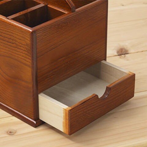 【自然木の美しさと、暮らしに溶け込むデザイン、暮らしに温かさを出します】長くご愛用いただけるように、国産の栗の木を用い、自社で一つひとつ心を込めて丁寧に仕上げました。お茶の間でつい散らかってしまう、リモコンや新聞紙、雑誌などをまとめて収納でき、簡単に持ち運びがしやすいように取っ手が付いています。下の引き出しには、爪切りや印鑑など、日用品から貴重品までさまざまな小物入れとしてご使用ください。自然木の美しさと、暮らしに溶け込むデザイン、木工芸を毎日の生活に取り入れてみませんか。
