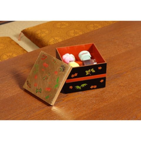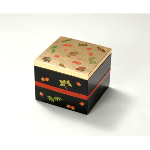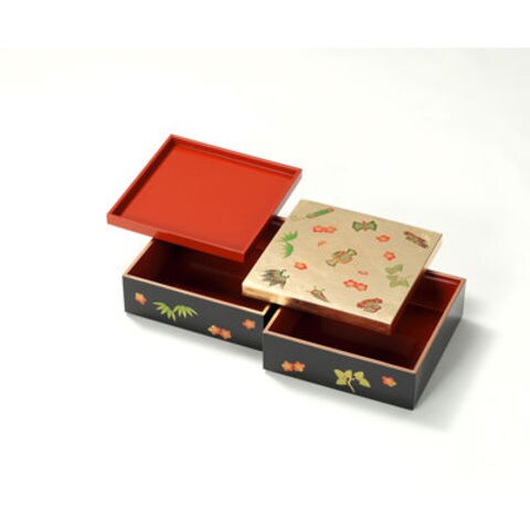 【石川県伝統の金箔、漆を贅沢に使った豪華な二段重!中皿付きで使い勝手も抜群】石川県伝統の金箔、漆を贅沢に使った豪華な二段重です。蓋には熟練の職人の手により金沢箔を施し、さらに高盛蒔絵で松竹梅などかわいらしい宝物のモチーフが加飾され、外側には黒漆、中は朱漆を使った華やかな造りになっています。中央には取り分けに便利な「中皿」が1枚プラスされ、使い勝手も抜群です。おめでたい時だけでなく、ちょっとした楽しい集いにも使いたくなる、現代感覚に富んだ二段重です。