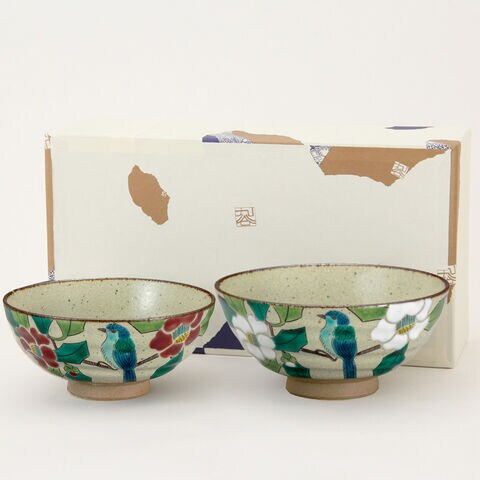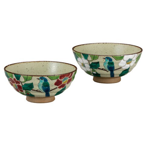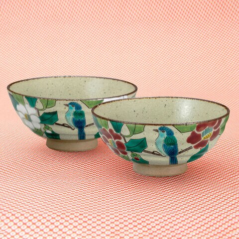 送料無料 九谷焼 組飯碗 椿に鳥〔飯碗大小各1個〕