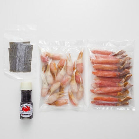 【「生冷凍ずわいがに棒ポーション」「生冷凍ずわいがに二本爪ポーション」「だし用昆布」「蟹しゃぶのたれ」のセット。】北海道札幌市でカニ・水産物販売や蟹料理専門店「蟹喰い処 蟹工船」などを展開する札幌蟹販の「ずわいかにしゃぶセット」です。札幌のかに問屋が厳選したズワイガニを使用し、脚部分で最も甘みの強い棒ポーションと歯ごたえのある二本爪ポーションに加工しました。食べやすく殻をカットしているので、包丁や調理ばさみも不要。年配の方や小さなお子さまのいるご家庭でも手軽に召し上がっていただけます。「だし用こんぶ」と「かにしゃぶ用たれ」もセット。生蟹ならではの美味しさを、ぜひお楽しみください。