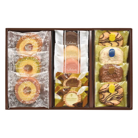 【数量・内容】2層バームクーヘン(キャラメル&ミルク・抹茶&ミルク・ストロベリー&ミルク)・ガレット(プレーン・ココア・ストロベリー)・プチタルト(ミルクチョコ・ホワイトチョコ)・ミルクチョコクッキー・ホワイトチョコクッキー×各1、キャラメルチョコクッキー×2