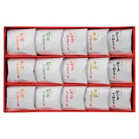 【数量・内容】黒糖かりん糖(10g)・黒胡麻かりん糖(10g)・牛乳かりん糖(10g)・抹茶かりん糖(10g)・いちごかりん糖(10g)×各3