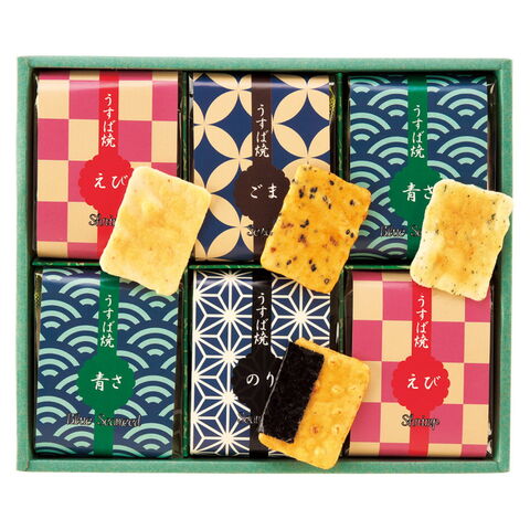 「うすば焼お煎餅6個詰合せ US-15」 うす~い生地をサッと焼き上げることで、香ばしいお米の風味とパリっとした食感になりました。第16回菓子博覧会にて高松宮名誉総裁賞受賞。