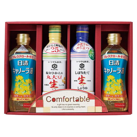 【数量・内容】日清キャノーラ油(350g)×2、キッコーマンしぼりたて生しょうゆ(450ml)・キッコーマン塩分ひかえめ丸大豆生しょうゆ(450ml)×各1