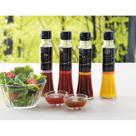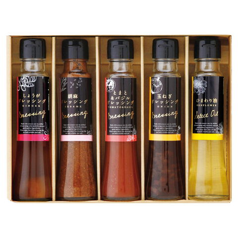 【数量・内容】しょうがドレッシング(100ml)・胡麻ドレッシング(100ml)・とまと&バジルドレッシング(100ml)・玉ねぎドレッシング(100ml)・ひまわり油(90g)×各1