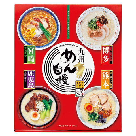 「九州めん自慢8食 MJS-BO」 ラーメン専用小麦「ラー麦」を100%使用した麺に、「博多」、「熊本」、「鹿児島」、「宮崎」と九州の4県をイメージしたスープをセットしました。