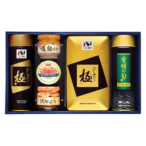 【数量・内容】味のり丸缶10袋詰(8切5枚)・焼のり半裁缶2袋詰(2切7枚)・のり茶漬け缶(6.4g×8袋)・紅ずわいがにほぐし身(55g)・焼鮭ほぐし瓶(50g)・鶏そぼろ瓶(50g)×各1