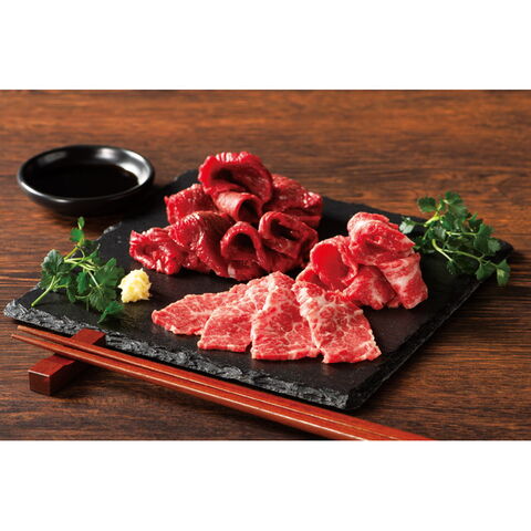 【数量・内容】ふじ馬刺し上赤身(80g)・ふじ馬刺し中トロ(80g)×各1、馬刺し用たれ(5ml)・生姜小袋(3g)×各4