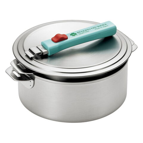 「燕熟の技 ハンドル着脱式鍋18cm&20cmセット EJQ-1000」 熟練の技巧、信頼の日本製。優れた耐久性と保温性を誇るステンレス製。ハンドルとツマミは可愛らしいパステルカラーで、ハンドルには幸運を表す四つ葉のクローバーのロゴ入りです。
