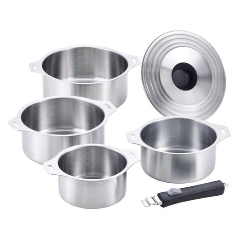 【数量・内容】鍋14cm(約1.1リットル)(約155×200×74mm)・鍋16cm(約1.6リットル)(約175×220×78mm)・鍋18cm(約2.1リットル)(約195×240×83mm)・鍋20cm(約2.8リットル)(約215×260×88mm)・兼用蓋・着脱ハンドル×各1