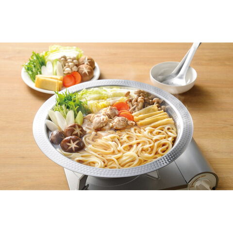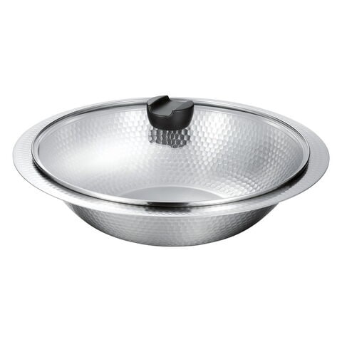 「彩食庵 IH対応蓋付よせしゃぶ鍋30cm MB-3447」 ステンレスの一枚板からプレスして作り出されたシンプルな鍋。取っ手代わりになる広めのフチで見た目もすっきり。鍋料理の他、大皿としても使えます。ガラス蓋の取っ手にツールを一時置きすることができます。
