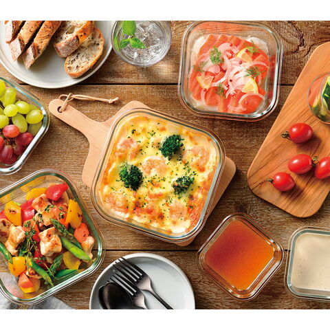 「レッシュ 耐熱ガラス容器2点セット ME-7395」 本体は耐熱温度差120度の耐熱ガラスなので電子レンジはもちろん、オーブン調理も可能。ニオイもつきにくいです。蓋はシリコーンパッキン&4点ロックでしっかり保存することができます。ガラスで透明なので冷蔵庫の中を見たときに一目で中身を確認できます。食洗機OK。