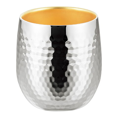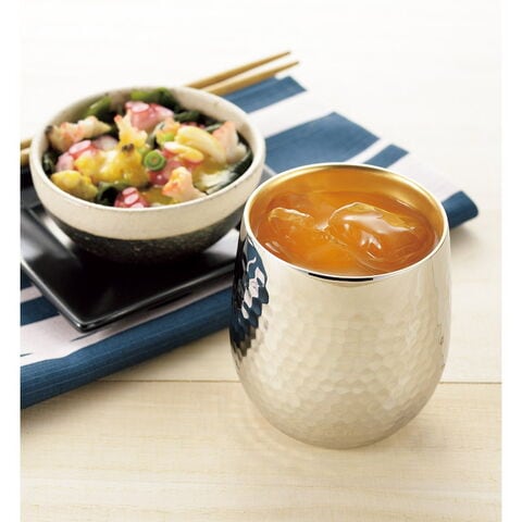 「燕熟の技 ステンレス二重ロックカップ250ml(内面金メッキ) EJA-750」 保冷・保温に優れた二重構造。輝きを増す重厚感ある鎚目模様。内面には金メッキを施し、豪華さとともに飲み物本来の味を堪能できます。