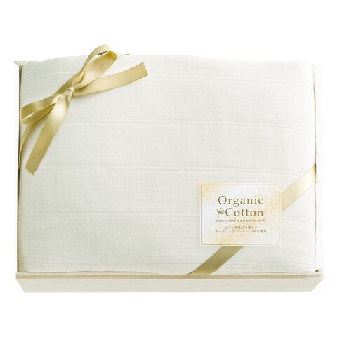 「オーガニックコットン五重ガーゼ毛布(国産木箱入) KOGC-10075」 綿本来の風合いが生む自然の安らぎ 三年間化学薬品を使用していない土壌で栽培された「オーガニックコットン」を使用した毛布です。綿本来の生成り色の毛布は、軽く柔らかな肌ざわりで保温性・保湿性にもすぐれています。高級感のある木箱に入れてお届けします。