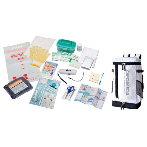 【数量・内容】リュック(約500×280×150mm)×1、スマホ対応ダイナモFMラジオLEDライト・非常用給水バッグ(5リットル)・シュラフ・防寒シート・非常用トイレ・すべり止め手袋・ポケットティッシュ(8W)・ふせんメモセット・ボールペン・救急箱・カット綿(3枚)・カットガーゼ(3枚)・救急絆創膏(2サイズ×3枚)・サージカルテープ・包帯・ハサミ・ピンセット・毛抜き・耳かき・清浄綿(2枚入×3枚)・宿泊セット用ポーチ・カミソリ・ハブラシセット・コンパクトブラシ・シャンプー&コンディショナー・石鹸・タオル・ヘアーバンド・ゴミ袋(45リットル10枚入)・防災ガイド×各1