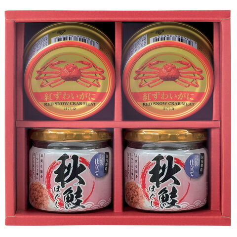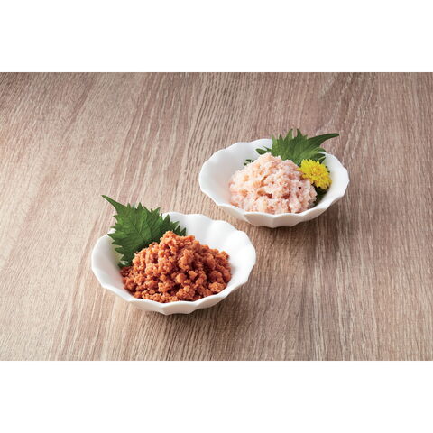 【数量・内容】紅ずわいがに(ほぐし身) 55g・秋鮭ほぐし 50g×各2