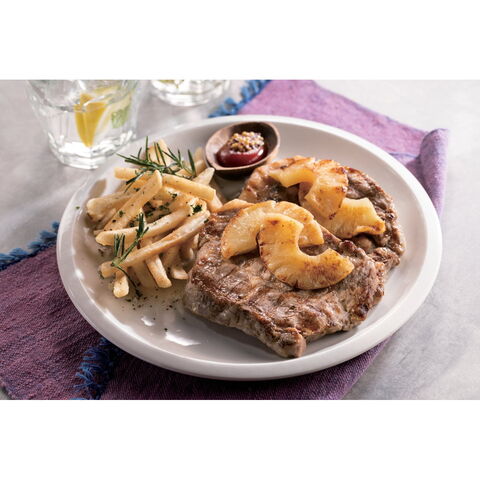 「ブラッセリートモ ポークグリルドステーキ」 豚肉をパインとバターソースで味わうポークステーキ。豚肉とパイナップルを一緒に調理したバターソースのほのかに香るやわらかくしっとりした簡単調理のポークステーキをお楽しみください。