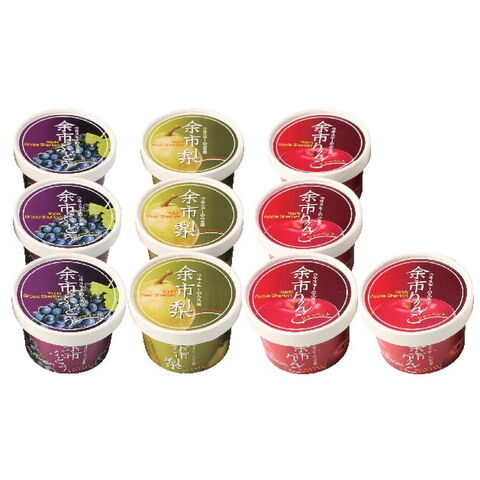 【数量・内容】余市ぶどうシャーベット・余市梨シャーベット各100ml×3、余市りんごシャーベット100ml×4