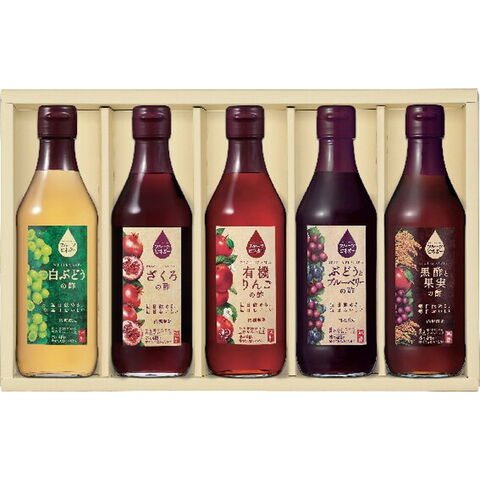 【数量・内容】白ぶどうの酢・ざくろの酢・有機りんごの酢・ぶどうとブルーベリーの酢・黒酢と果実の酢各360ml