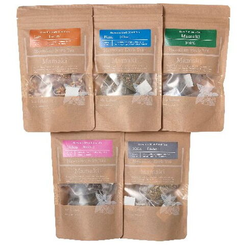 【数量・内容】ハワイアンハーブティー ママキ100%(1g×5)、ハワイアンハーブブレンドティー ピカイ(クリア・2g×10)、マリエ(リラックス・1.5g×10)、ノヘア(ビューティー・2g×10)、ララ(ウォーム・2g×10)×各1