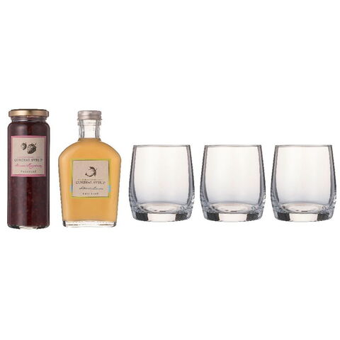 【数量・内容】苺ミルクのもと・コーディアルシロップ(瀬戸内レモン)各200ml、グラス×3 ●サイズ/グラス:約高さ9×径7.5cm(口径約6.8cm)、容量約310ml ●素材/グラス:ガラス