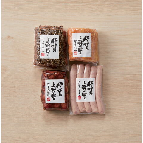「伊賀上野の里詰合せ」 素材の味を大切に丁寧に作り上げたロースハム、あらびきウインナー、ペッパーポーク、ロース焼豚とバラエティーに富んだ詰合わせです。