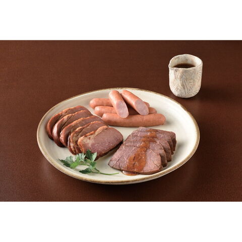 【数量・内容】ローストビーフ200g、ローストビーフソース40g、特選燻しポークハム180g、網焼き焼鶏140g、生ハム45g、あらびき燻しウインナー80g×2※パッケージデザインが変更になる場合がございます。