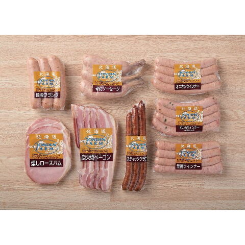 「北海道トンデンファーム詰合せ」 直下式炭火製法でじっくり燻煙して仕上げたハム・ベーコン・ウィンナー類をバラエティーに詰合わせました。その風味、味わいをお楽しみください。