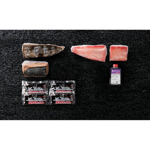 「鹿児島県枕崎産 一本釣り鰹 タタキ・サシミ各400/タレ4・ショウユ1」 伝統的な一本釣り漁法でとれた鰹を、船内にて急速凍結。炭火焼は一度も解凍せずに加工しています。