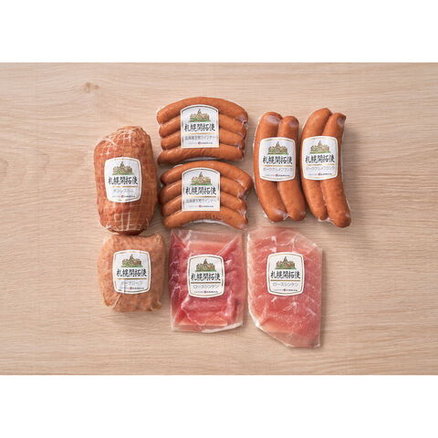 「開拓使セット」 肉本来の旨みと玉ねぎの甘みをギュッと閉じ込めたポークローフと、玉ねぎを練り込んで仕上げたウインナー、豚ロース肉を岩塩を使いじっくり調味した生ハムのセットです。