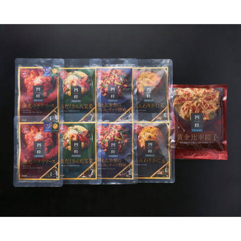 【数量・内容】海老のチリソース150g・具だくさん八宝菜170g・鶏と九条葱のカシューナッツ炒め150g・ふんわりかに玉185g×各2、黄金比率餃子180g