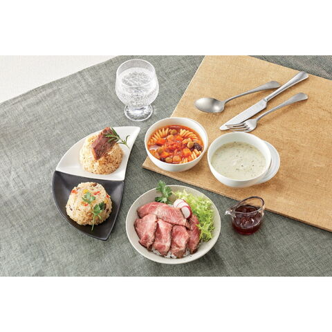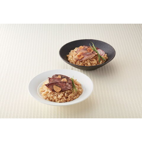 「ビーフステーキガーリックライス」 ガーリックの風味が効いたご飯の上に、牛肉を食べやすくカットしてのせています。電子レンジで温めるだけで簡単にお召し上がりいただける、2種の牛肉ライスのセットです。
