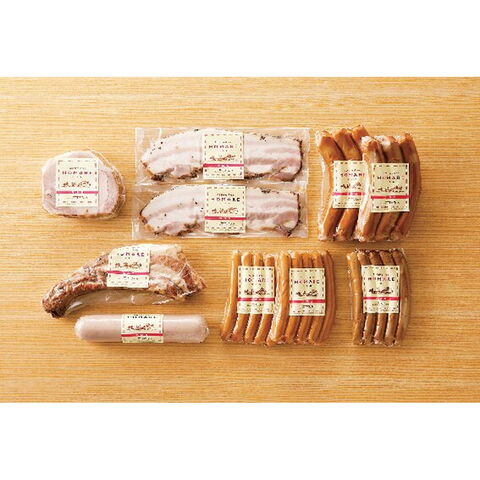 【数量・内容】ロースハムブロック300g、ベーコンステーキ63g×2、燻製スペアリブ200g、プレーンウインナー(5本入り)110g×2、黒胡椒ウインナー(5本入り)110g、フランク(3本入り)160g×2、ボロニアソーセージ160g