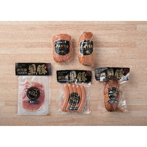【数量・内容】黒豚炭火焼豚220g、黒豚ポークローフ200g、黒豚荒挽きウインナー120g、黒豚生ハム50g、黒豚ボンレスハム250g