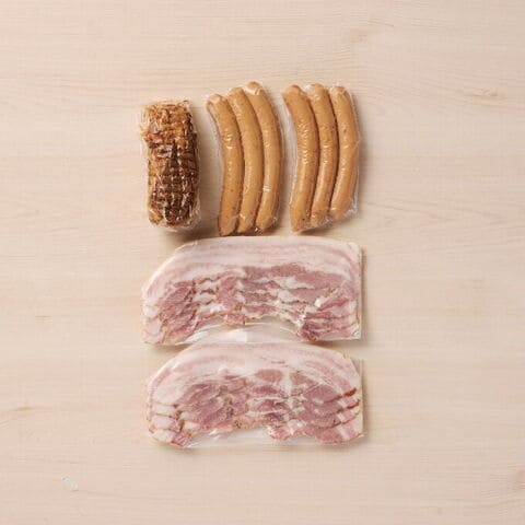 【数量・内容】無塩せきウィンナー120g×2、無塩せきバラベーコン90g×2、無塩せきバラチャーシュー250g×1